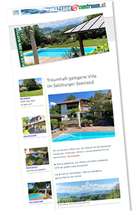 Aktuelle, mehrseitige Information, aktive eMail Adresse!![]() Mehrseitiges Immobilien-Exposé für eine Villa in ruhiger, wunderschöner Hanglage auf den Mattsee (nahe Salzburg). Mit großzügiger Pool-Landschaft, Garagen, ... Beworben mit einer semantischen eMail Adresse, gefunden als Landingpage Factsheet. Immobilien zum Freuen! |