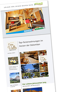 Ruhige Lage, gute Erreichbarkeit, schönes und angenehmes Ambiente (Stil und Einrichtung) sollen adäquat beschrieben werden. Starke, emotionale Headlines unterstützen interessanten Content! Einfache, günstige und wirkungsvolle Landingpages machen Lust auf gutes Essen und Trinken, freundlichen Service, typische Sport- und Freizeitangebote, Relax- und Wellnesseinrichtungen, ... Und auf das, was Land und Leute zu bieten haben. Zum Beispiel > |