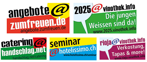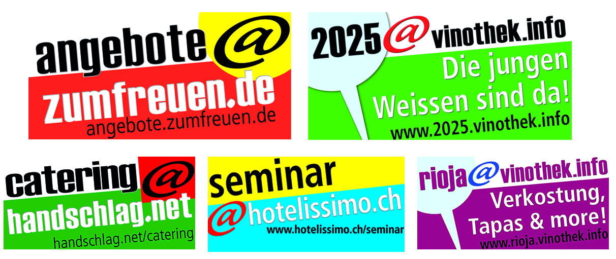 Die gezeigten Beispiele sind in Form und Farbe "frei". Grafische Gestaltung folgt immer den Wünschen unserer Kunden. Sie sehen einige unserer aktuellen e Mail Adressen und SubDomains, die viele attraktive Lösungen möglich machen ... ![]() |